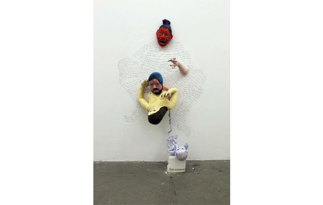 embroidered textile sculpture and text on wall, ca180x130 cm