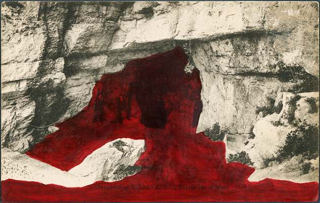 Antique postcard, acrylic paint, box mounted in acrylic case